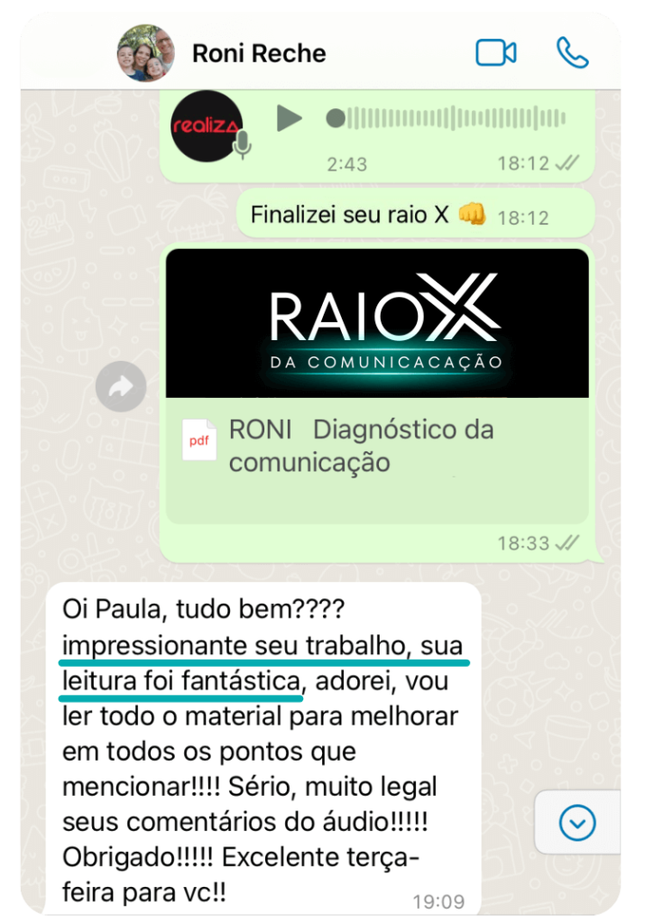 O RAIO X é a análise completa da sua comunicação com uma reunião online e individual para apresentar os resultados.